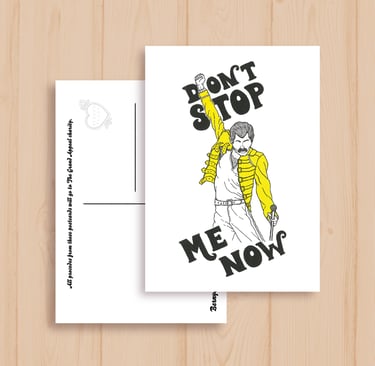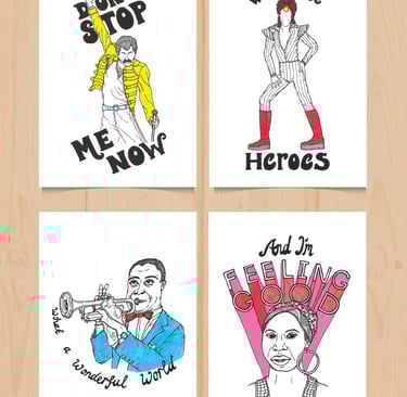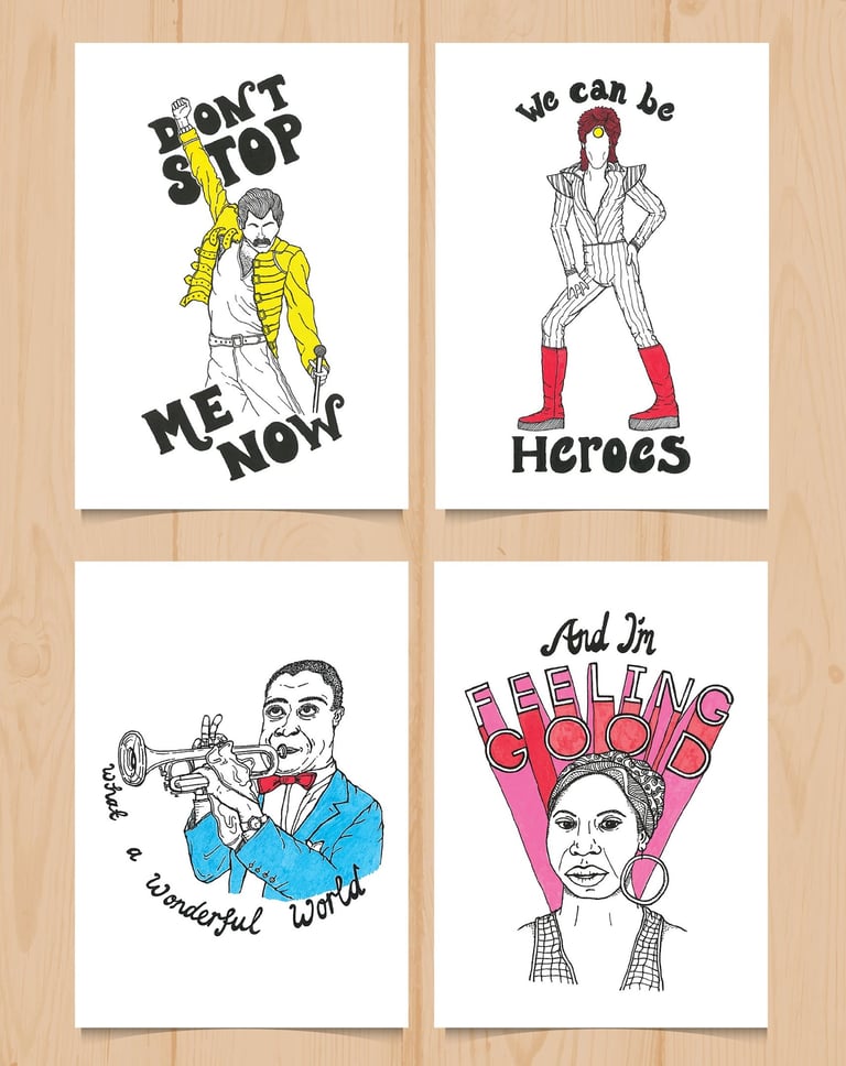 Hand-illustrated postcards of 4 iconic musicians, inspired by the Gromit Unleashed statue I designed, 'The Hound of Music', for the Gromit Unleashed 2 Trail.